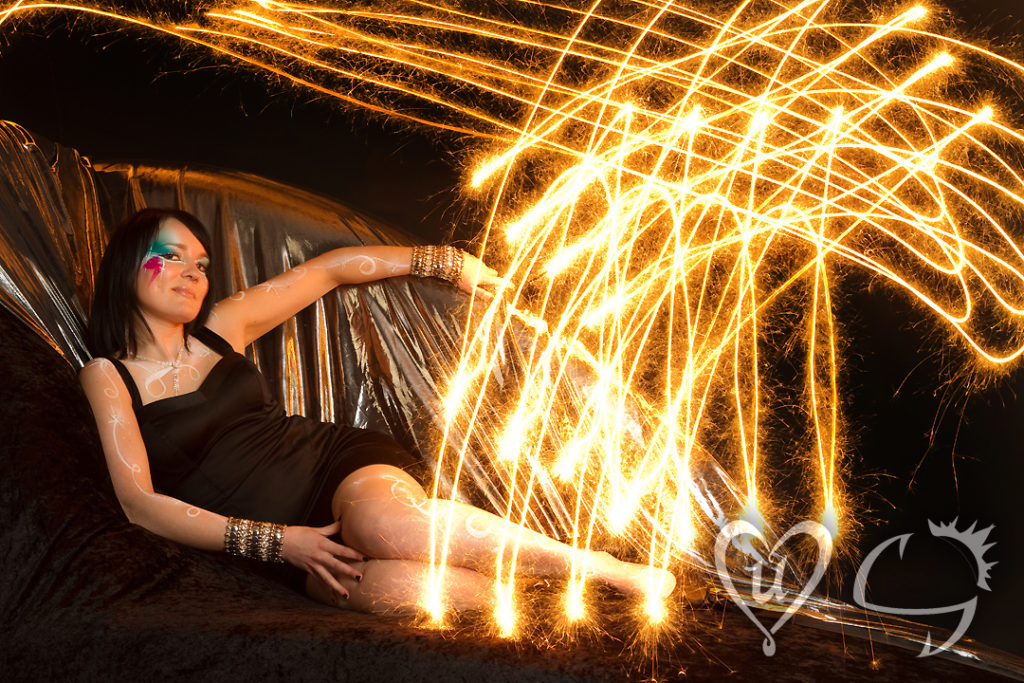 The prep for the shoot involved facepaint, body paint and accessories. It also involved preparing some giant sparkler “claws” so that I could hold 5 sparklers in each hand at a time. Once Marlee was ready, we did a series of photos with her posing in the paint, and then a series where I did some”light-painting” with the sparklers. The resulting images appear as if there is electricity moving all around her. Marlee would pose, the camera would ‘Flash!”, and in the following darkness I danced around her with the lit sparklers. The photoshoot ended with a hot burning ember sizzling into Steve’s beautiful couch– eek! Lucky for us the burn mark blends right in with the leopard print– and the photos look ELECTRIFYING!