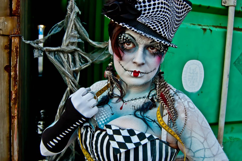 We teamed up with Evan Boyd Photography. New to the scene, Evan has been capturing beautiful images of dance events at Sunset Room, including gorgeous portraits and amazing photos of the live painting. In the art room, I transformed Dj Lyssa into an evil doll decorated in stitches, checkers, crazy makeup… and a little bit of blood. She and Evan headed out behind Captial Iron, an industrial area filled with shipping containers, giant machinery and a beautiful backdrop of the ocean. In the last moments of the setting sun, Lyssa posed with her headphones and scissors, staring insanely into the camera… a DEADLY interpretation of Evil Sally.