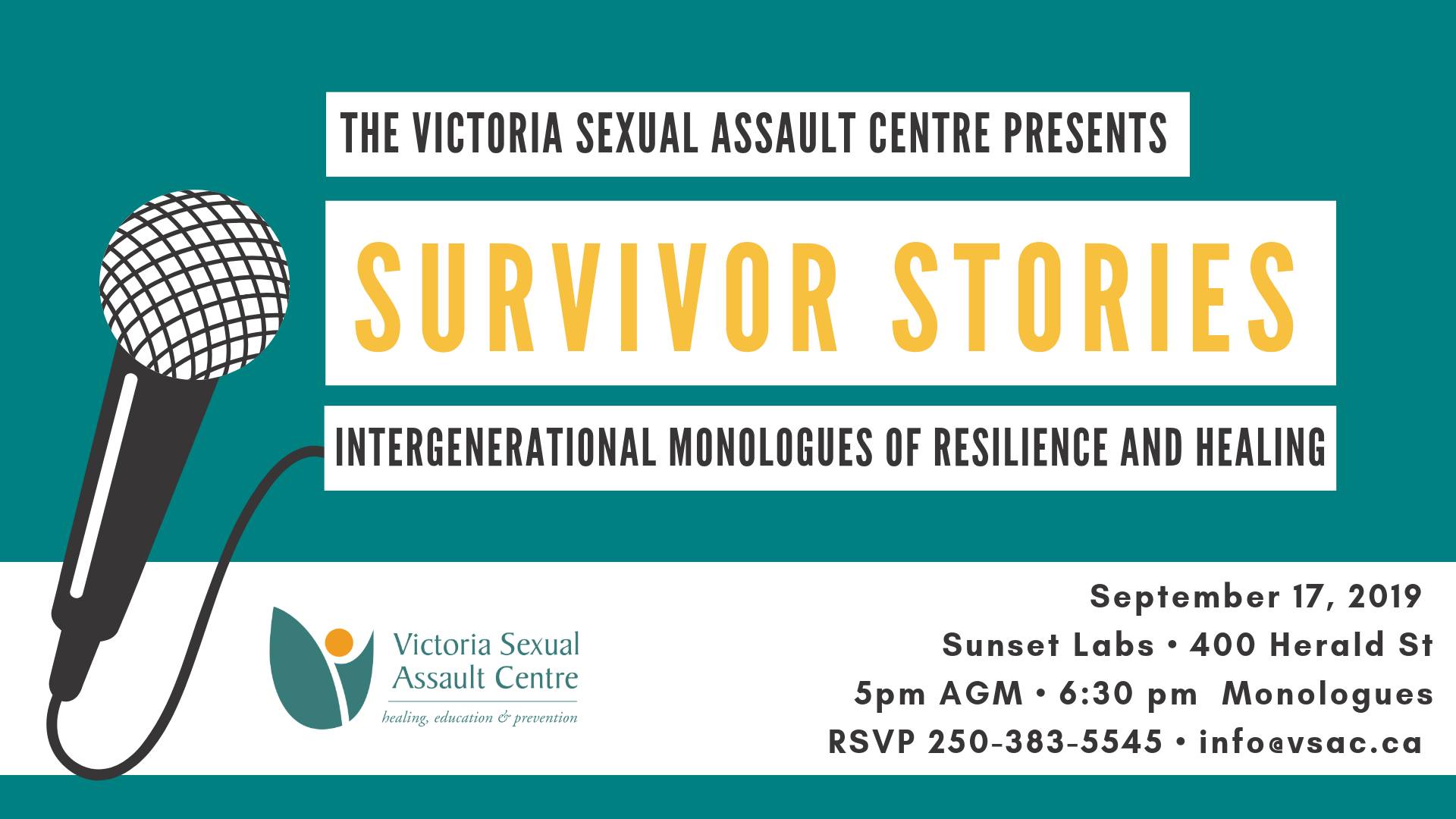 Please join us for our 2019 Annual General Meeting followed by a monologue presentation performed by staff of the Victoria Sexual Assault Centre. Survivor Stories chronicles the experiences of victims of sexual assault aged 101 to 15 years old, and their journeys towards healing.* This monologue presentation strives to give voice to survivors and the... Read More